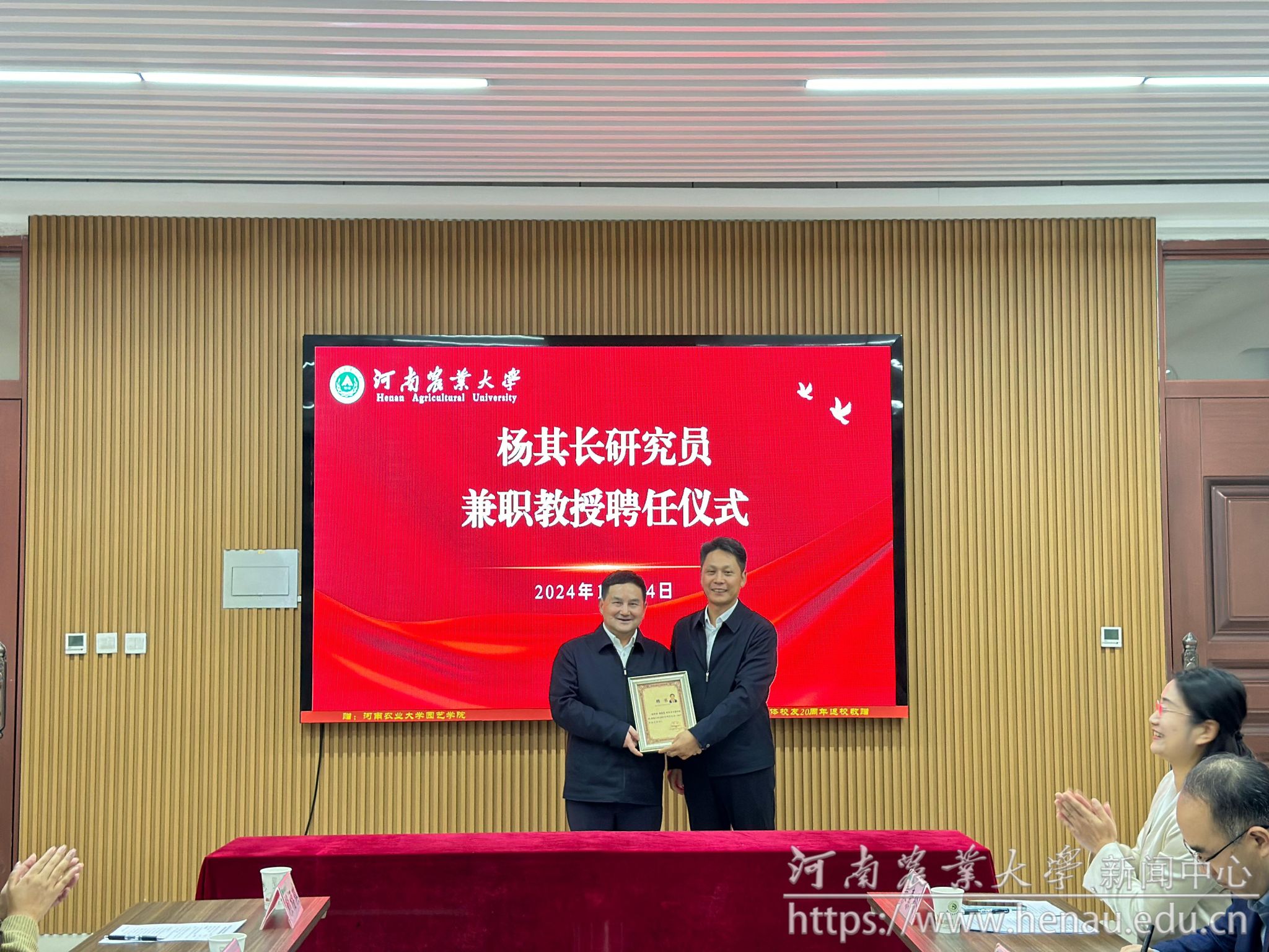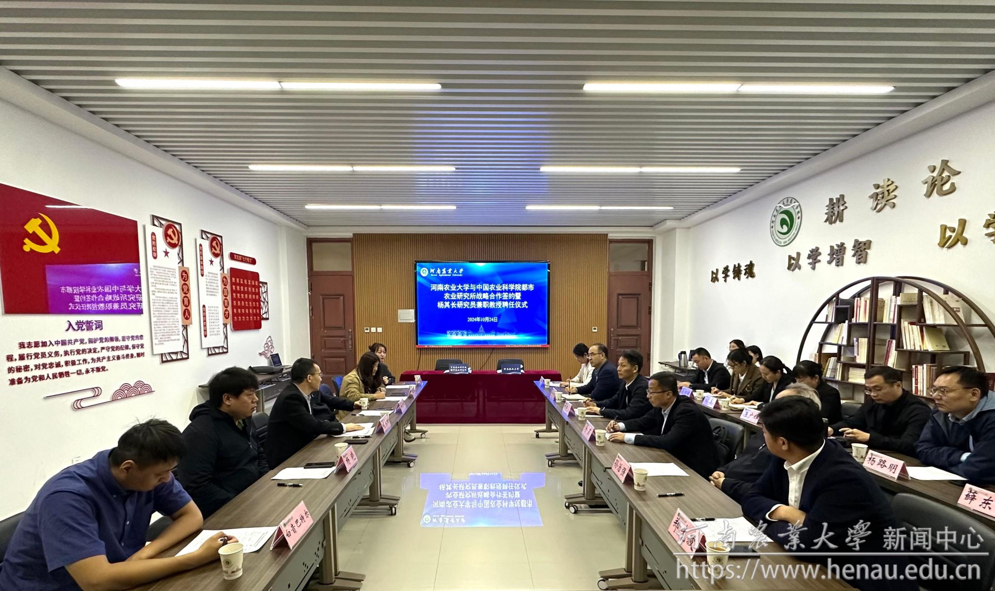 本网讯(通讯员 王静浩)10月24日,学校与中国农业科学院都市农业研究所战略合作签约暨杨其长研究员兼职教授聘任仪式在龙子湖校区举行。副校长刘晓永,中国农业科学院都市农业研究所纪委书记、副所长胡永松出席签约仪式。中国农业科学院都市农业研究所、学校发展规划处、中国现代农业联合研究生院筹建办相关负责人,园艺学院领导班子及教师代表参加会议。园艺学院党委书记秦素玲主持签约仪式。