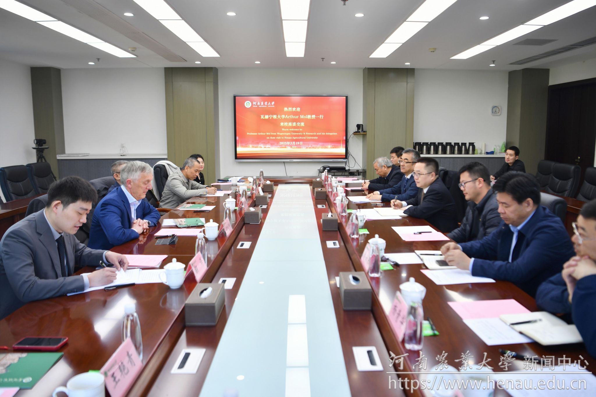 本网讯(通讯员 刘洋 图片 李洪振)3月19日,学校与北京京瓦农业科技创新中心交流座谈会在龙子湖校区举行。副校长张朝阳,瓦赫宁根大学原校长、北京京瓦农业科技创新中心国际顾问奥斯·摩尔出席座谈会。京瓦中心主任范学彬、首席战略合规官王俊勋、中心副主任王艳青、高级项目经理张雅清、河南工业大学生命科学学院教授孙忠科,以及学校相关职能部门和学院负责人及教师参加座谈。